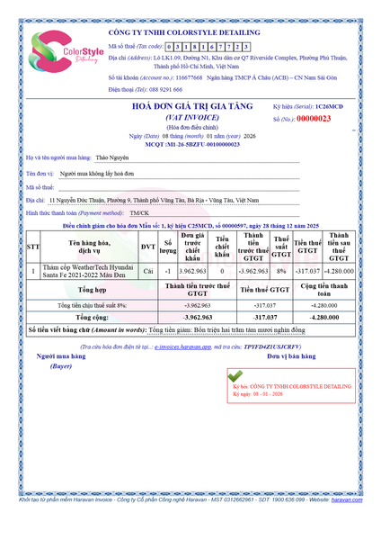 Hai bên cùng thống nhất lập bản ghi nhận sai sót do bên bán xuất bán hàng cho bên mua tại hóa đơn số 00000597, ký hiệu C25MCD, lập ngày 28/12/2025. Nay lập hóa đơn điều chỉnh số 00000023, ký hiệu C26MCD ngày 08/01/2026